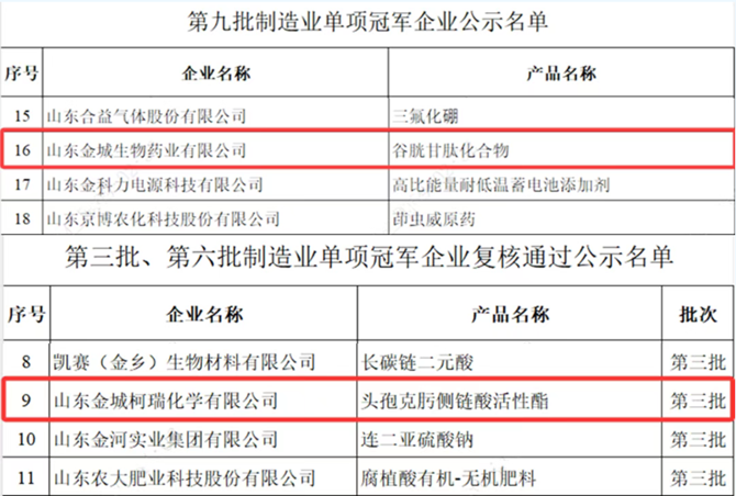 日前,工业和信息化部发布了第九批制造业单项冠军企业和复核通过第三批、第六批制造业单项冠军企业名单,山东金城生物药业有限公司被认定为第九批制造业单项冠军企业,山东金城柯瑞化学有限公司通过第三批制造业单项冠军企业复核。截至目前,金城医药已获得3个国家级制造业单项冠军企业和2个省级制造业单项冠军企业。